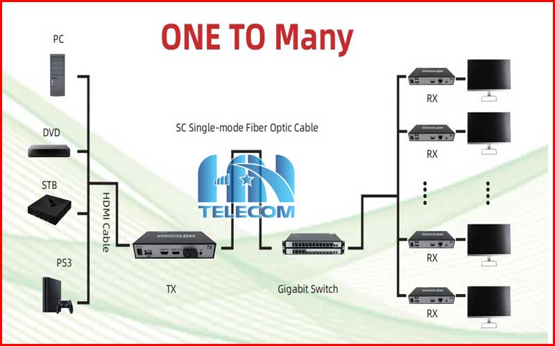 Ngoài việc kết nốt 1 truyền 1 nhận, bộ kéo dài HDMI qua cáp quang 3M-HDMI-USB-20S này cũng có thế kết nối 1 truyền nhiều nhận. Bằng cách thông qua Switch chia mạng