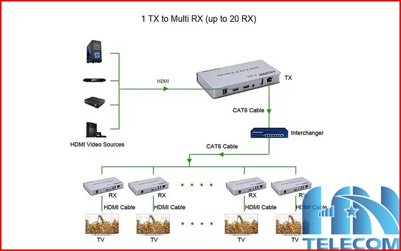 Sơ đồ kết nối 1 truyền nhiều nhận của Bộ kéo dài HDMI qua LAN 200m 3M Telecom