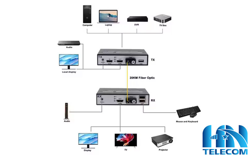 Bộ kéo dài HDMI KVM qua sợi quang là thiết bị mở rộng tín hiệu chủ yếu được kết nối qua sợi quang dựa trên IP. Với các tính năng hiện đại và chuyên nghiệp thông qua giái pháp KVM bằng IP. Hệ thống máy tính có thể được truy cập từ thiết bị đầu cuối. Được điều khiển bằng bộ thu USB từ xa thông qua mạng nội bộ.