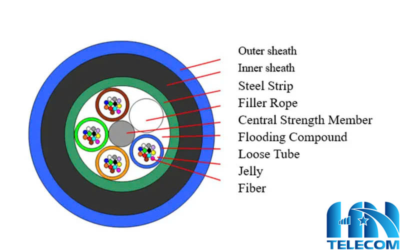 Các ống lỏng này được quấn quanh thành các bộ phận chịu lực trung tâ, được làm từ thép. Sau đó chúng được bọc lại bằng lớp PSP và được làm đầy chất chống thầm nước. Cuối cùng cáp được bọc lại hoàn thiện với 2 lớp vỏ nhựa PE màu đen và PVC chống cháy màu xanh lam.