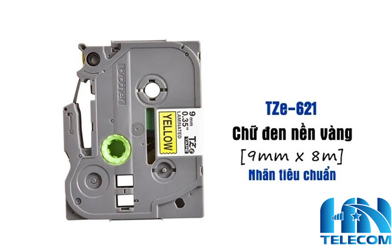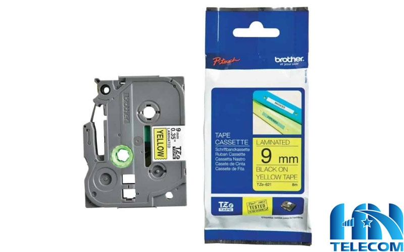 Băng giấy in nhãn Brother TZE-621 9mm, kích thước 9mm x 8m (dài x rộng). Được in chữ đen trên nền vàng, sử dụng công nghệ in nhiệt trực tiếp không cần tới mực. Đồng thời cán màng PE giúp chống thấm. TZE-621 là thiết bị chuyên dùng cho dòng máy in nhãn cán màng Brother PT.