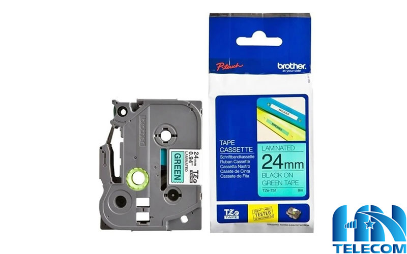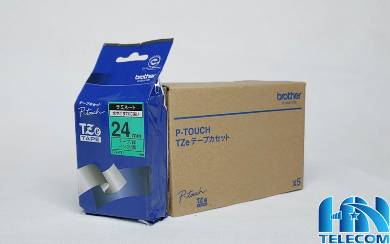 - Nhãn TZE-751 khổ 24mm x dài 8m, chữ đen trên nền xanh lá, có kích thước và màu sắc đặc trưng. Hỗ trợ nhận diện thông tin nhìn trực quan bằng mắt hoặc có thể in mã vạch. Hay QR code để tự động hóa bằng máy quét mã vạch