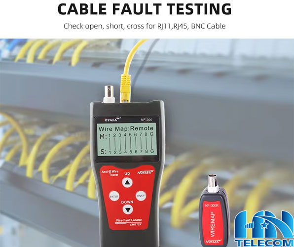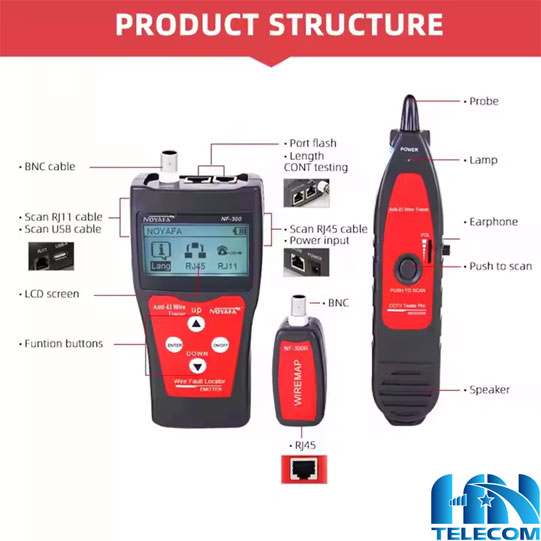Bộ test mạng Noyafa NF-300 có thể test được cáp RJ45, RJ11, hay test dây cáp máy in USB. Thậm chí chúng có thể test dây cáp đồng trục có màn hình LCD hiển thị cho kết quả chính xác cao nhất. Nó còn có thể đo chiều dài của cáp mạng, cáp đồng trục xác định được vị trí đứt cáp. Ngoài ra, chúng có thể dò dây trong bó dây hoặc dò dây trong tường. Như vậy có thể xác định được vị trí của dây. Cổng RJ45 có thể kiểm tra thông tin dây mạng, dây cáp đồng trục, ngắn mạch, hở mạch. Hoặc chéo cáp, đứt dây.
