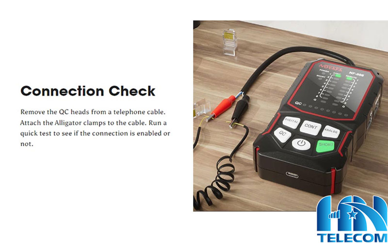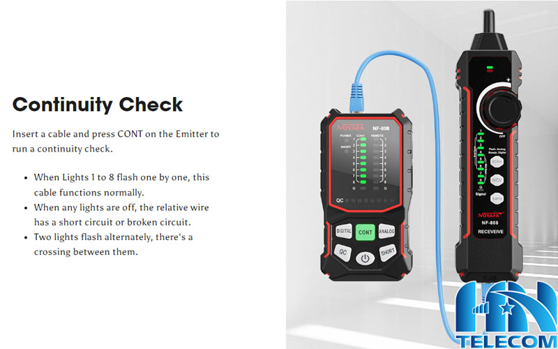 Nhìn chung máy test cáp mạng NOYAFA NF-808 cơ bản là một thiết bị di động chạy bằng pin với nguồn điện. Một hoặc nhiều chỉ số điện áp, có thể sắp xếp chuyển đổi hoặc quét để kiểm tra dây dẫn. Máy cũng có thể trang bị một ví điều khiển và một màn hình để tự động hóa quá trình thử nghiệm. Cũng như hiển thị các kết quả thử nghiệm. Đặc biệt là đối với cáp nhiều dây dẫn.