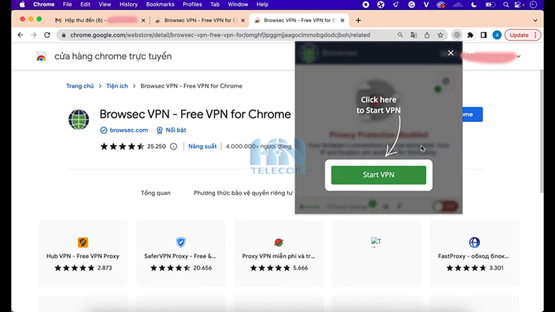 • Bước 1 : Mở trình duyệt Chrome > Chọn vào đường Link bên dưới và nhấn Thêm vào Chrome để cài tiện ích Browsec VPN