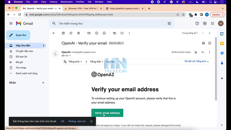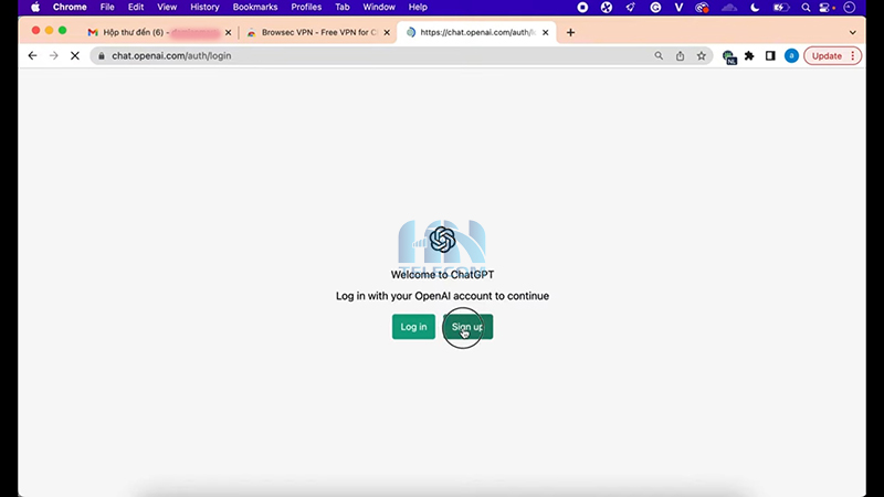 • Bước 2: Bật tiện ích Browsec VPN lên và tiếp tục truy cập vào trang chủ của ChatGPT theo đường link phía dưới > Chọn vào Sign up để bắt đầu đăng ký tài khoản
