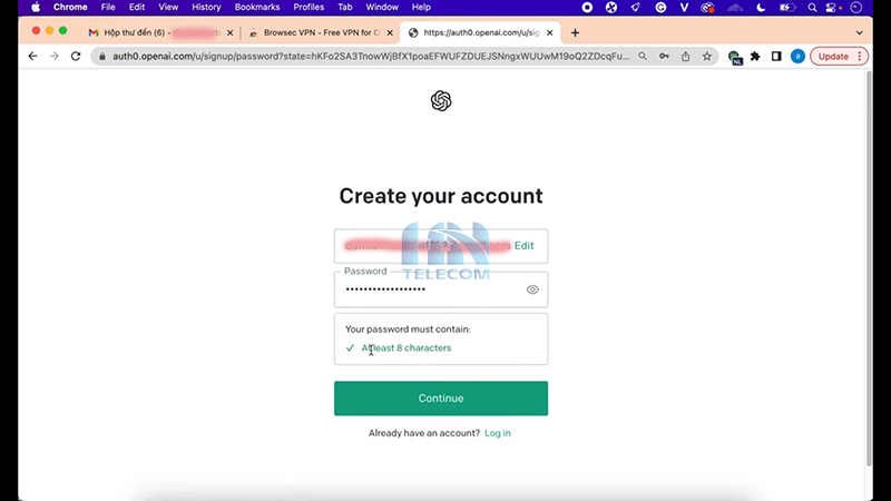 • Bước 3: Nhập tài khoản Email muốn đăng ký vào và nhấn Continue để tiếp tục đến với bước tiếp theo để tiến hành tạo tài khoản ChatGPT cho mail của mình