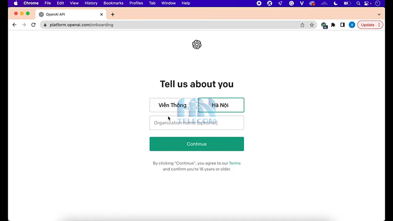 • Bước 5: Hãy điền họ và tên của bạn vào đây và nhấn Continue để qua bước này.