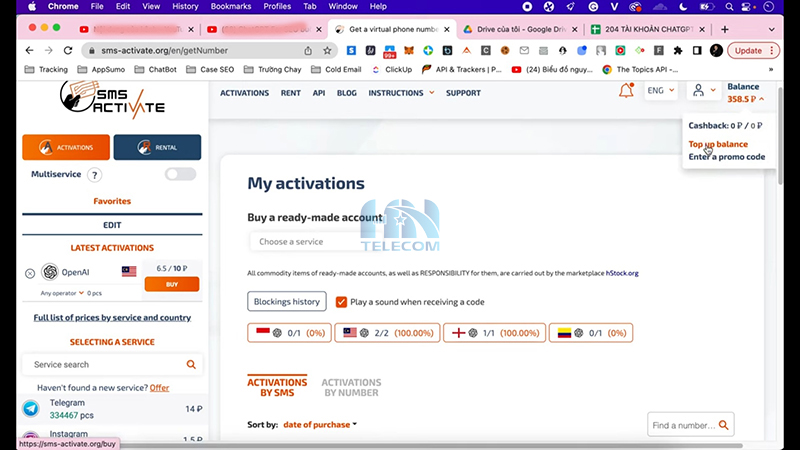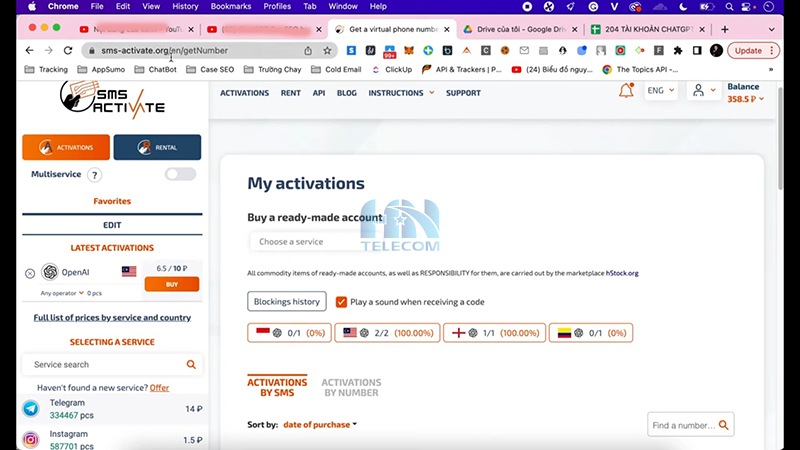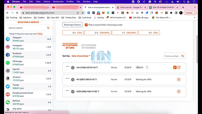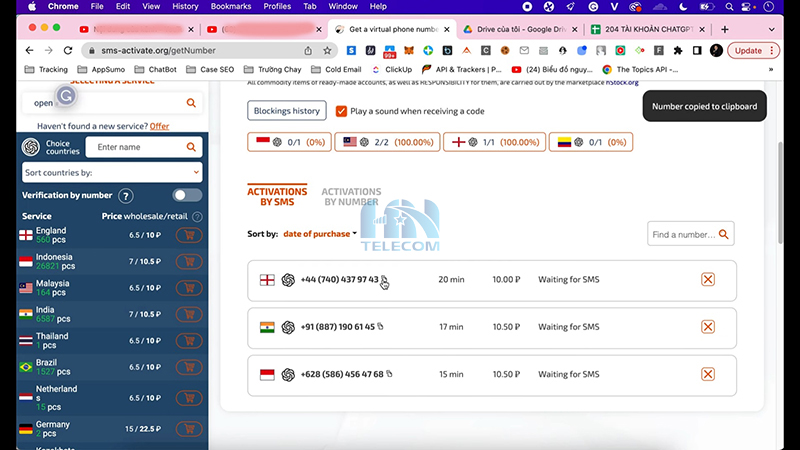 • Bước 11: Mua SĐT USA hoặc Anh… Bao gồm của các nước có hỗ trợ dịch vụ OpenAI. Sau đó Coppy số.